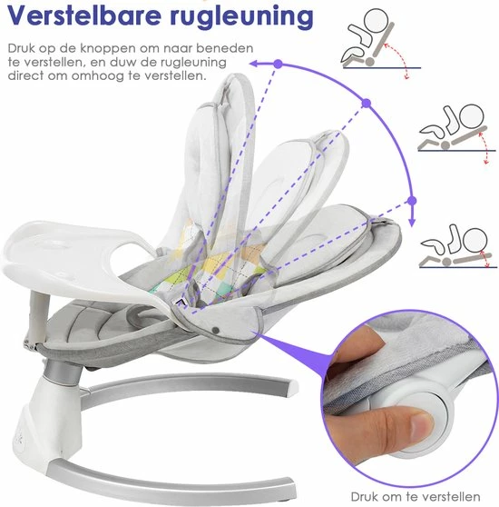 Verstelbare rugleuning met 3 versnellingen – De schommelstoel kan worden gekanteld: Pas de hoek van de rugleuning aan voor een comfortabele ervaring voor de baby.