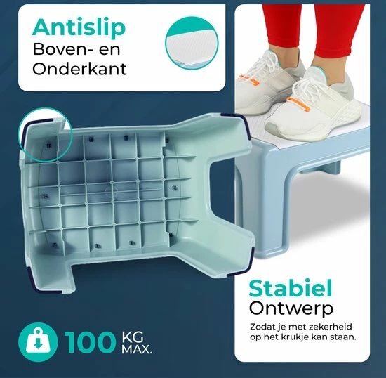 Antislip ontwerp; het is natuurlijk niet de bedoeling dat het krukje (kind) zomaar wegschuift of dat je van het opstapje afvalt. Daarom is het krukje voorzien van een handige antislip laag op de boven- en onderkant om uitglijden te voorkomen.