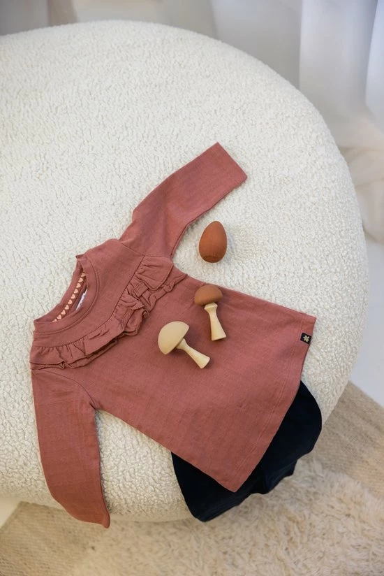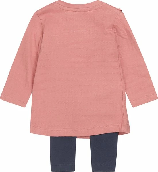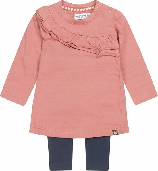 Girly Dirkje jurkje in oudroze tint. Het jurkje met lange mouwen is gemaakt van een fijne katoen met structuur. Als leuk detail heeft deze jurk ruffles op het voorpand. De bijpassende donkerblauwe legging maakt de outfit helemaal af!