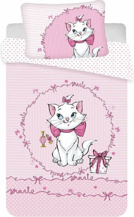 Disney Aristocats Baby Dekbedovertrek, Marie. Dit lieve baby-overtrek van Disney’s Aristocats is een echte aanwinst voor de babykamer. Op het overtrek staat een afbeelding van Marie Cat op een mooie roze achtergrond. De keerzijde van de overtrek heeft een stippeltjes patroon, wat een leuk effect geeft als je een stukje openslaat bij het opmaken van het bedje. Een geweldig idee voor een cadeau bij een babyshower of een kraam cadeau.