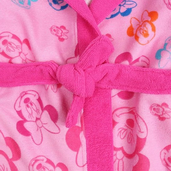 Roze, warme kinderbadjas met capuchon, geknoopt in de taille, met een herhaalde afbeelding van Minnie Mouse.