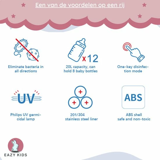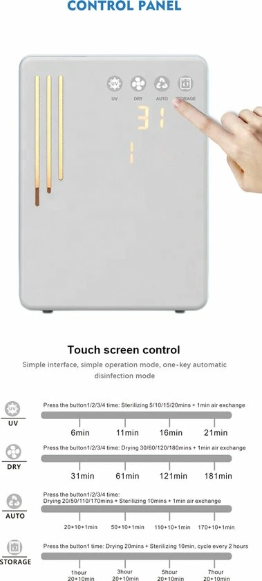 - STORAGE MODE: De spullen niet direct nodig? Of zeker zijn dat alles schoon blijft? Kies voor de storage mode en je kan tot 72u alles steriel bewaren.