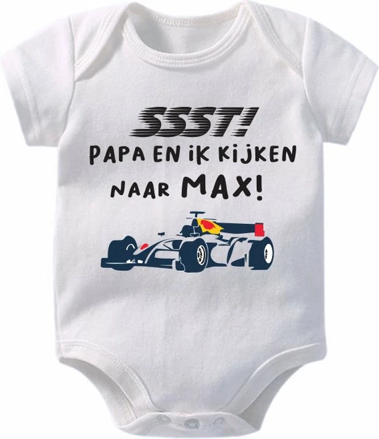 Hospitrix Baby Rompertje Met Tekst “SSST! Papa En Ik Kijken Naar MAX – Maat M 62/68 – Go Max – Korte Mouw – Cadeau – Zwangerschap – Aankondiging – Verstappen – Romper