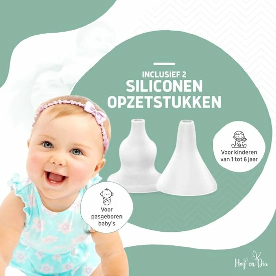 Door de 2 verschillende siliconen opzetstukken is de neusreiniger van Hoy en Dia geschikt voor baby?s en kinderen van alle leeftijden. Kies in alle gevallen de passende siliconen tip die uw baby en kindje helpt met het veilig, voorzichtig en makkelijk uitzuigen van het loslopende neusslijm.