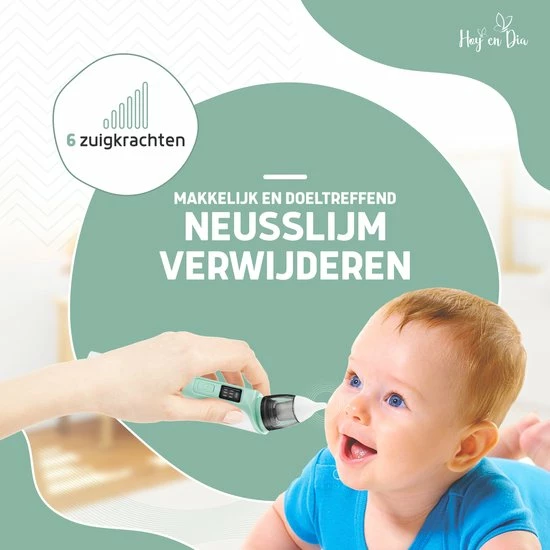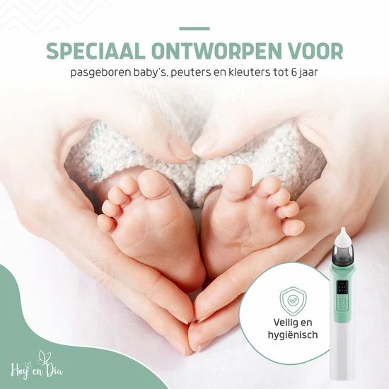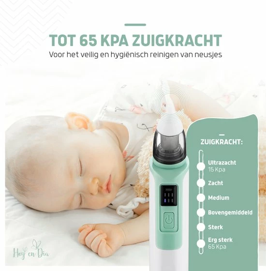 De elektrische neusreiniger van Hoy en Dia is speciaal ontworpen voor pasgeboren baby’s, peuters en kleuters tot 6 jaar. Dit houdt in dat de zuigkracht sterk genoeg is (maximaal 65Kpa) om het loslopende neusslijm te verwijderen en het geen kwaad kan doen aan een baby en kinderneusje. Wij garanderen u een veilig en hygi?nisch artikel voor het reinigen van baby en kinderneusjes. Voor vragen staan wij altijd tot uw beschikking.