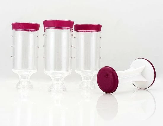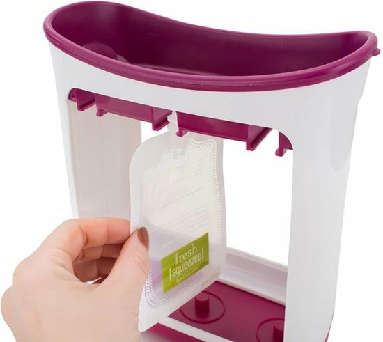Je giet het eten gemakkelijk in de buizen en drukt het omlaag in de knijpzakjes of squeeze pouch. De zakjes kunnen gemakkelijk ingevroren worden en later pas gebruikt worden.