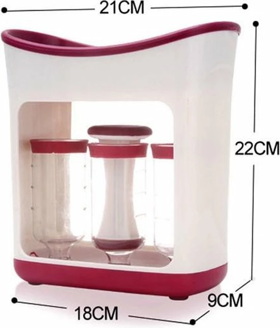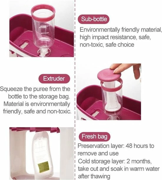Een systeem om babyvoeding of tussendoortjes in handige zakjes te doen zodat het kan bewaard worden in diepvries of frigo in kleine porties en later kan gebruikt worden.