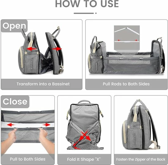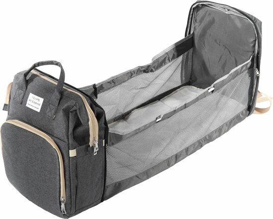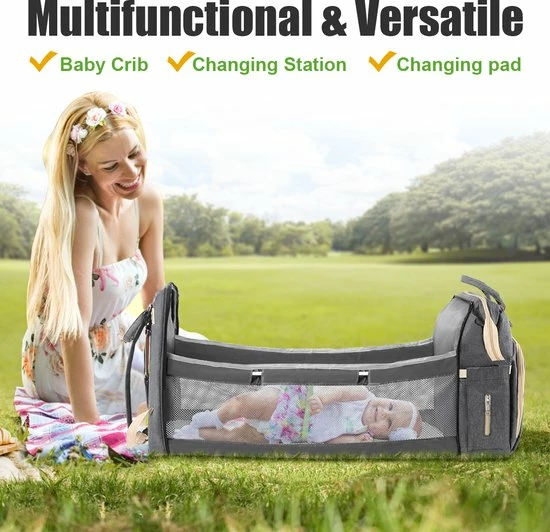 ?Draagbare opvouwbare wieg? Luiertas met opvouwbare wieg is eenvoudig in elkaar te zetten, sneller te installeren en te verwijderen met de 2 opvouwbare stangen. Terwijl papa en mama op reis zijn, kan de baby genieten van een ruime, schone en comfortabele ruimte gecre?erd door het verschoonstation met een zacht kussen om een dutje te doen of luiers te verschonen.