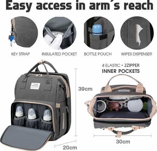 ?Multifunctionele zakken? De luier rugzak heeft 13 verschillende gebruikszakken. 4 elastische zakken kunnen worden gebruikt om luiers, slabbetjes en andere baby toiletartikelen te houden; 1 waterdichte rits zak kan houden baby’s natte en de rest rits zak kan opbergen verschillende items. 3 aluminiumfolie isolatie zakken kunnen 3 babyflessen in en houden ze warm. 2 Zijvakken zijn voor flessen, doekjes of tissues. Op de achterkant van de luiertas zit een anti-diefstal zakje voor je telefoon, sleutels, kaartjes, etc.