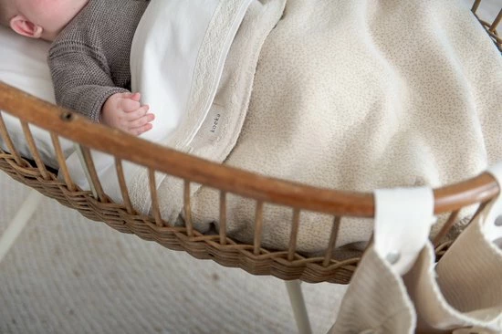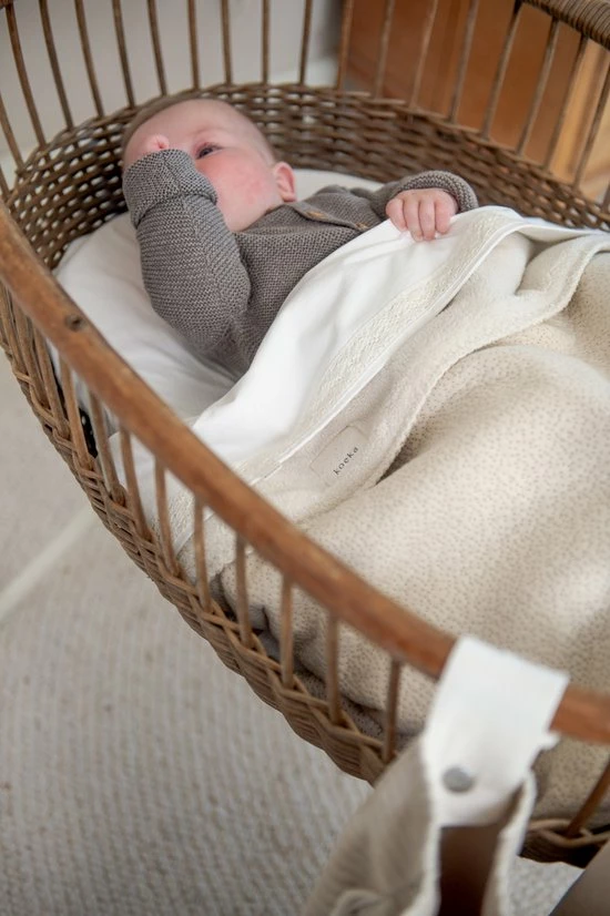 Deze wiegdeken is gemaakt van biologisch katoen en gevoerd met warme, zachte teddy. Riga is een comfortabele gebreide jersey jacquard stof. De subtiele, kleine ingebreide stipjes dwarrelen in een onregelmatig patroon over de stof en geven een speels en levendig effect.