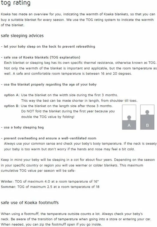 Wij snappen dat het lastig kan zijn om te bepalen welke deken je nu het beste kunt kopen. De juiste keuze hangt af van een aantal factoren en daarom heeft Koeka een keuzehulp samengesteld om je op weg te helpen. Deze ?How to choose your blanket? keuzehulp vind je tussen de afbeeldingen. Meet de kamertemperatuur van je kinderkamer en bepaal wat de TOG waarde is van de slaapzak, pyjama en lakentje (als je die gebruikt). Raadpleeg daarna de keuzehulp om te bepalen wat het advies is voor de minimale en maximale TOG waarde van je deken.