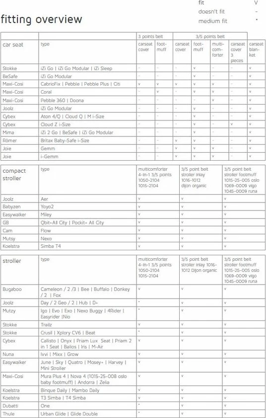 Wij snappen dat het lastig kan zijn om de perfecte voetenzak te vinden. Het is belangrijk om rekening te houden met de cumulatieve TOG waarde van de producten die je voor je kindje gebruikt. Tussen de afbeeldingen staat een overzicht met de verschillende TOG waarden van de Koeka outdoor producten. Bedenk dat wanneer de outdoor producten in een indoor situatie gebruikt worden, bijvoorbeeld in de auto of in een winkelcentrum, rekening moet worden gehouden met de binnen temperatuur. Open de rits van de voetenzak of doe een laagje kleding uit zodat je kindje het niet te warm krijgt. Om te kijken of de voetenzak in jouw autostoel past, heeft Koeka een ?fitting overview? samengesteld. Deze keuzehulp vind je tussen de afbeeldingen.