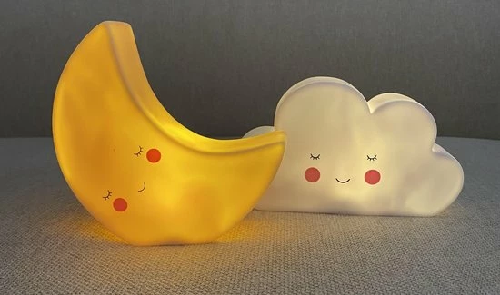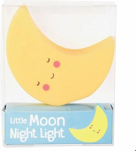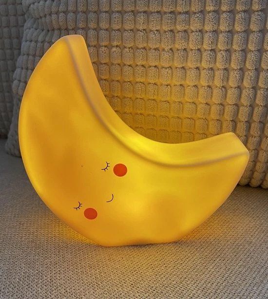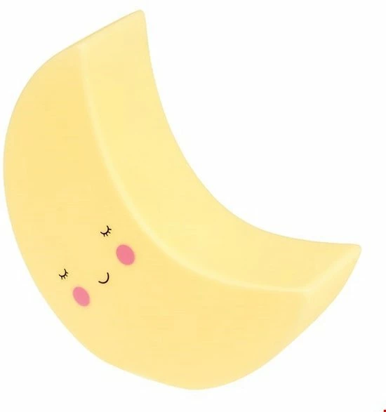 Dit lieve nachtlampje in maanvorm geeft een zachte gloed. Het werkt op 3 LR44 batterijtjes (meegeleverd) en is daardoor gemakkelijk mee te nemen voor bijvoorbeeld een logeerpartijtje. Materiaal: plastic – LED Formaat: ? 13.5 cm hoog