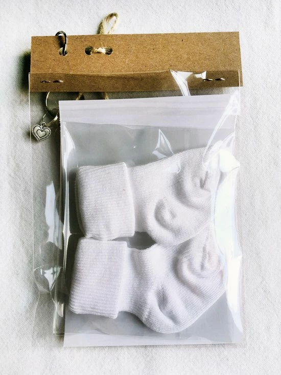In dit cadeau zit 1 paar babysokjes, kaartje met tekst en een sleutelhanger met een bedeltje van een hartje.