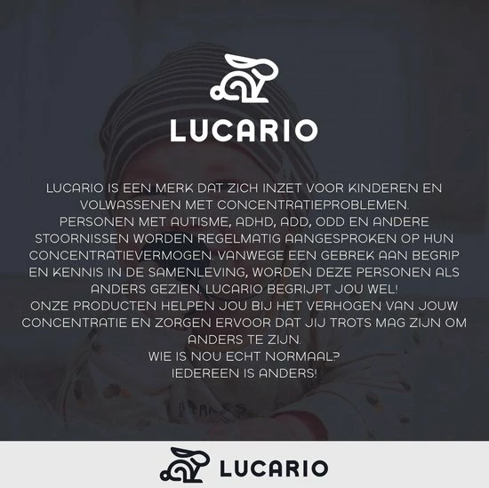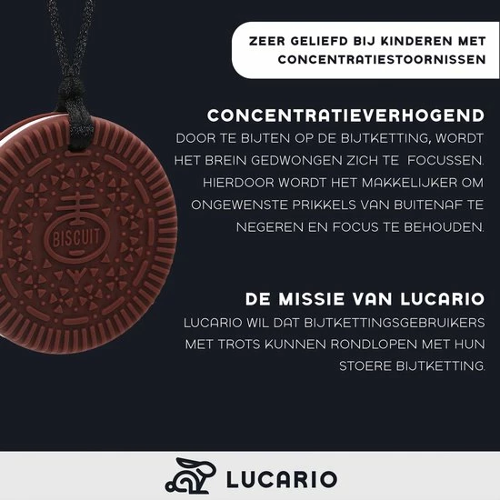 Lucario zet zich al jaren in voor kinderen en volwassenen met concentratie problemen. Vaak worden kinderen met concentratiestoornissen zoals ADHD, ADD, ODD en Autisme vergeten. Mensen vinden het moeilijk om zich in hun schoenen te plaatsen. Ze begrijpen vaak niet hoe moeilijk het kan zijn om je door verschillende prikkels niet te kunnen focussen op alledaagse bezigheden. Lucario begrijpt deze mensen wel. Speciaal voor deze groep ontwikkelde Lucario de bijtketting. Door te bijten op de bijtketting wordt het brein gedwongen zich te focussen. Hierdoor wordt het makkelijker om ongewenste prikkels van buitenaf te negeren en focus te behouden.