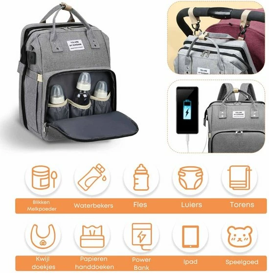 Wij helpen u met een handige haak die u aan uw wandelwagen kunt bevestigen, zodat u de Luiertas-rugzak overal mee naartoe kunt nemen. Hij heeft zelfs een ingebouwde USB-poort, zodat u uw powerbank in de tas kunt bewaren en uw telefoon aan de buitenkant kunt aansluiten!
