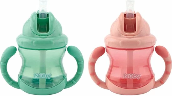 Nûby – Flip-It Antilekbeker Met Handvatten – 2-pack – Roze & Groen – 240ml – 12m+