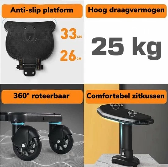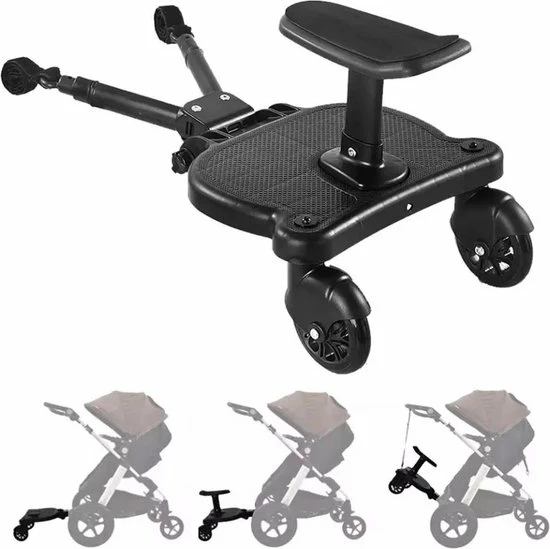 Opzoek naar een stevige en veilige meerijdplank? Dan is dit meerijdplankje wellicht iets voor jou! Ideale oplossing voor als je gaat wandelen met een baby en een wat ouder kind. De baby zit lekker in de kinderwagen en het oudere kindje kan staand of zittend mee op het meerijdplankje. Dit zonder dat uw oudere kindje moe wordt van het wandelen. Je kunt het meerijdplankje zowel aan de voorkant of aan de achterkant van de kinderwagen bevestigen.
