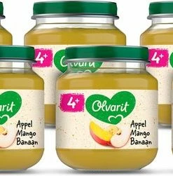 6-pack Olvarit Fruithapjes Appel Mango Banaan, geschikt voor baby?s van 4 tot 6 maanden oud.