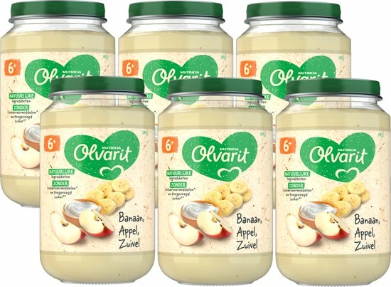 6-pack Olvarit Fruithapjes Banaan Appel Zuivel, geschikt voor baby?s vanaf 6 maanden oud.