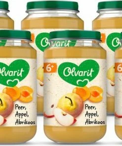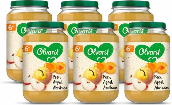 6-pack Olvarit Fruithapjes Peer Appel Abrikoos, geschikt voor baby’s vanaf 6 maanden oud.