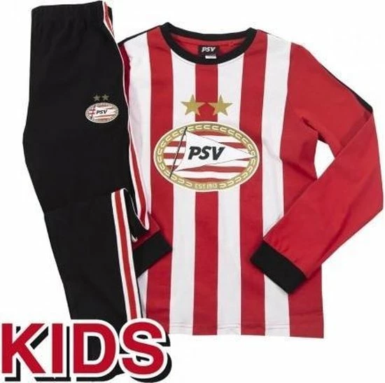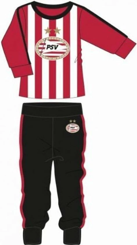 PSV is ??n van de grootste voetbalclubs van Nederland en verkoopt allemaal leuke producten voor de fans! De jongere PSV-fan valt heerlijk in slaap met deze pyjama van PSV. De pyjama bestaat uit een rood-wit shirt en een zwarte broek met rode baan. Deze pyjama is gebaseerd op het thuistenue van PSV. Zowel het shirt als de broek zijn gemaakt van 100% katoen.