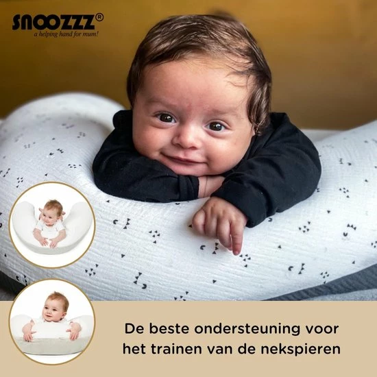 Voor de ontwikkeling van je baby is het belangrijk dat je je kindje regelmatig op de buik legt, uiteraard uitsluitend onder toezicht. De buikligging stimuleert de nekspieren en buikspieren van de baby wat belangrijk is voor zijn/haar ontwikkeling. Het Snoozzz voedingkussen is een uitstekend hulpmiddel hiervoor.