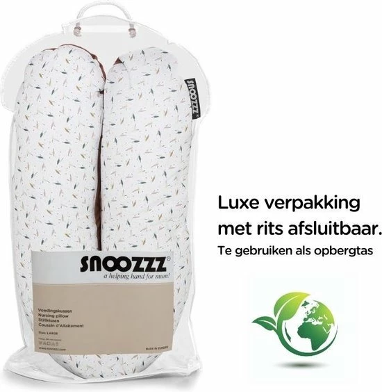 Het voedingskussen van Snoozzz zit verpakt in een luxe plastic tas die volledig afsluitbaar is met de rist in de bodem. Zo berg je het voedingskussen gemakkelijk op wanneer je het even niet gebruikt. Dankzij de handvatten aan de tas is het voedingskussen ook gemakkelijk mee te nemen.