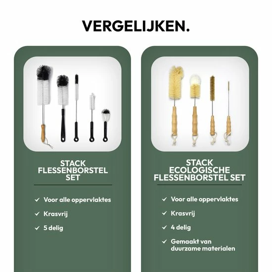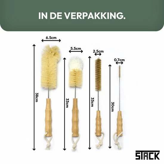 De STACK Ecologische Flessenborstel Set bestaat uit diverse formaten aan flessenborstels die te gebruiken zijn om moeilijk bereikbare vlekken of overblijfselen in mokken, (baby)flessen, glazen, bidons, de speen van uw babyfles of bijvoorbeeld smalle bloemvazen in een handomdraai te verwijderen. Ook voor het reinigen van moeilijk bereikbare oppervlakken in het huishouden is de set onmisbaar. Denkt u bijvoorbeeld aan de afvoer in uw keuken of badkamer, achter verwarmingsbuizen, in bouwkundige naden of kieren of bijvoorbeeld ventilatieroosters. De STACK Ecologische Flessenborstel Set is een onmisbaar hulpmiddel voor in het huishouden!