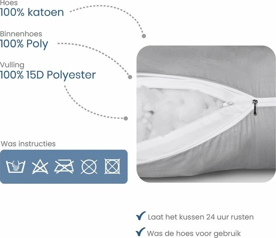 Ons kussen kenmerkt zich door zijn hoge afwerkingen en de 15D polyester technologie, daar waar D7 vulling de standaard is. Hierdoor blijft de vulling juist erg lang stevig en ondersteunend. Het kussen is extra gevuld met maar liefst 2500 gram van de duurzame D15-polyestervulling daar waar 1900 gram standaard is.