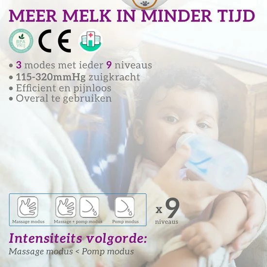 Voor moeders wiens borsten pijnlijk overvol zijn van moedermelk wordt aanbevolen om niveaus 7-9 van zuigmodus te gebruiken om zo snel de pijn te verlichten.